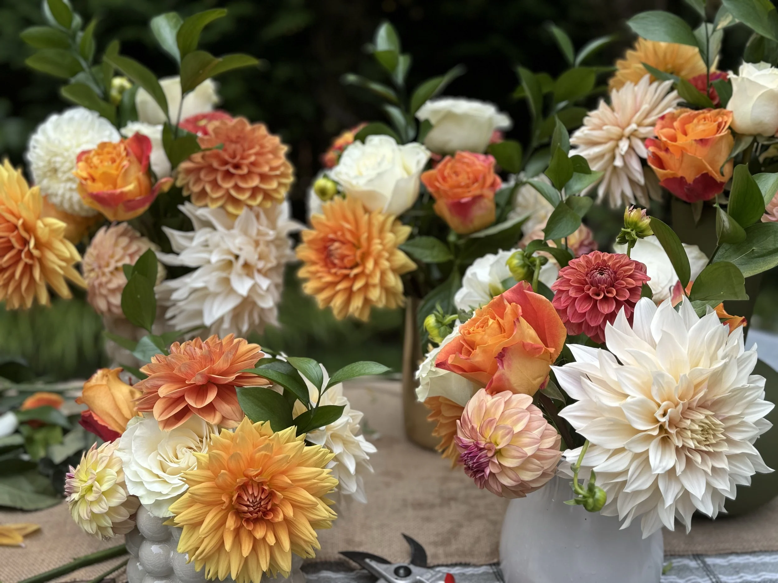 Hand-crafted floral arrangements featuring dahlias, peonies, and other blooms from Mckenzie’s garden